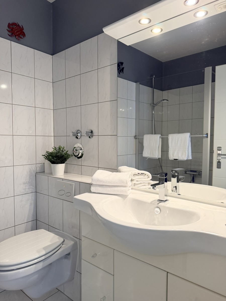Das Schlafzimmer bietet ein komfortables Doppelbett (180x200), das auf Wunsch auch getrennt werden kann, um individuellen Bedürfnissen gerecht zu werden. Das moderne Duschbad mit einer großzügigen, begehbaren Dusche, WC und Waschtisch mit Spiegel bietet alles, was Sie für Ihre Erfrischung benötigen.