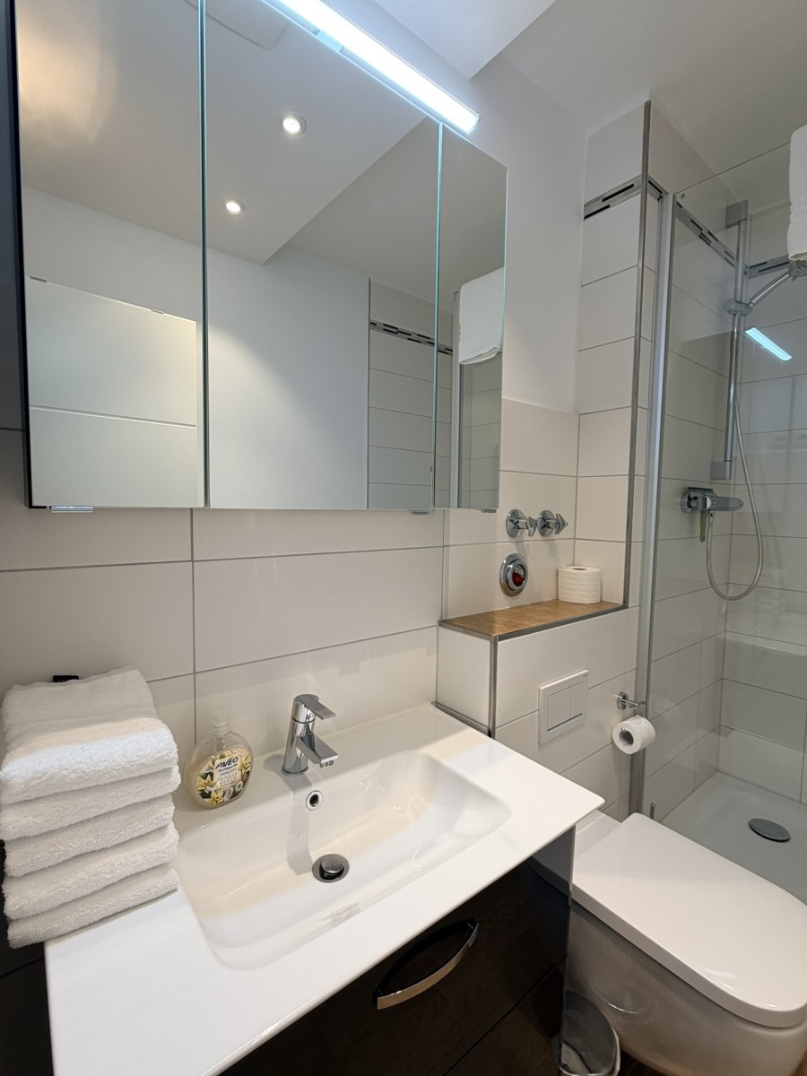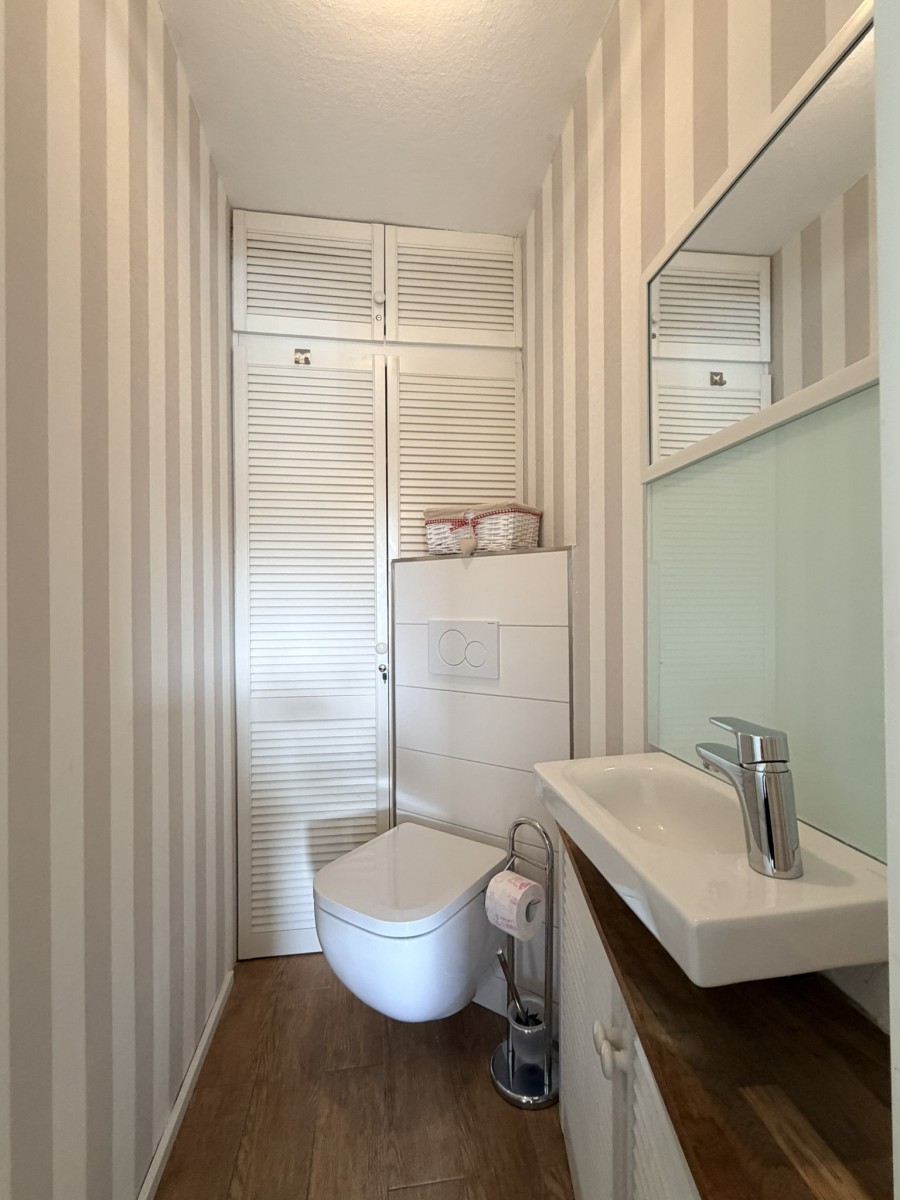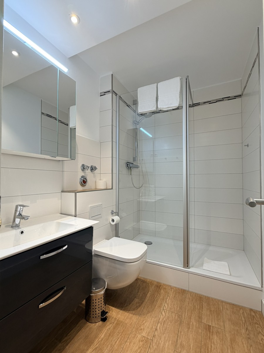Ein modernes Badezimmer mit begehbarer Dusche und WC und eine zusätzliche Gästetoilette runden diese schöne Ferienwohnung ab.