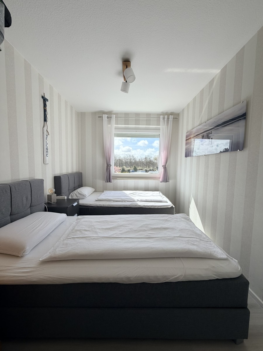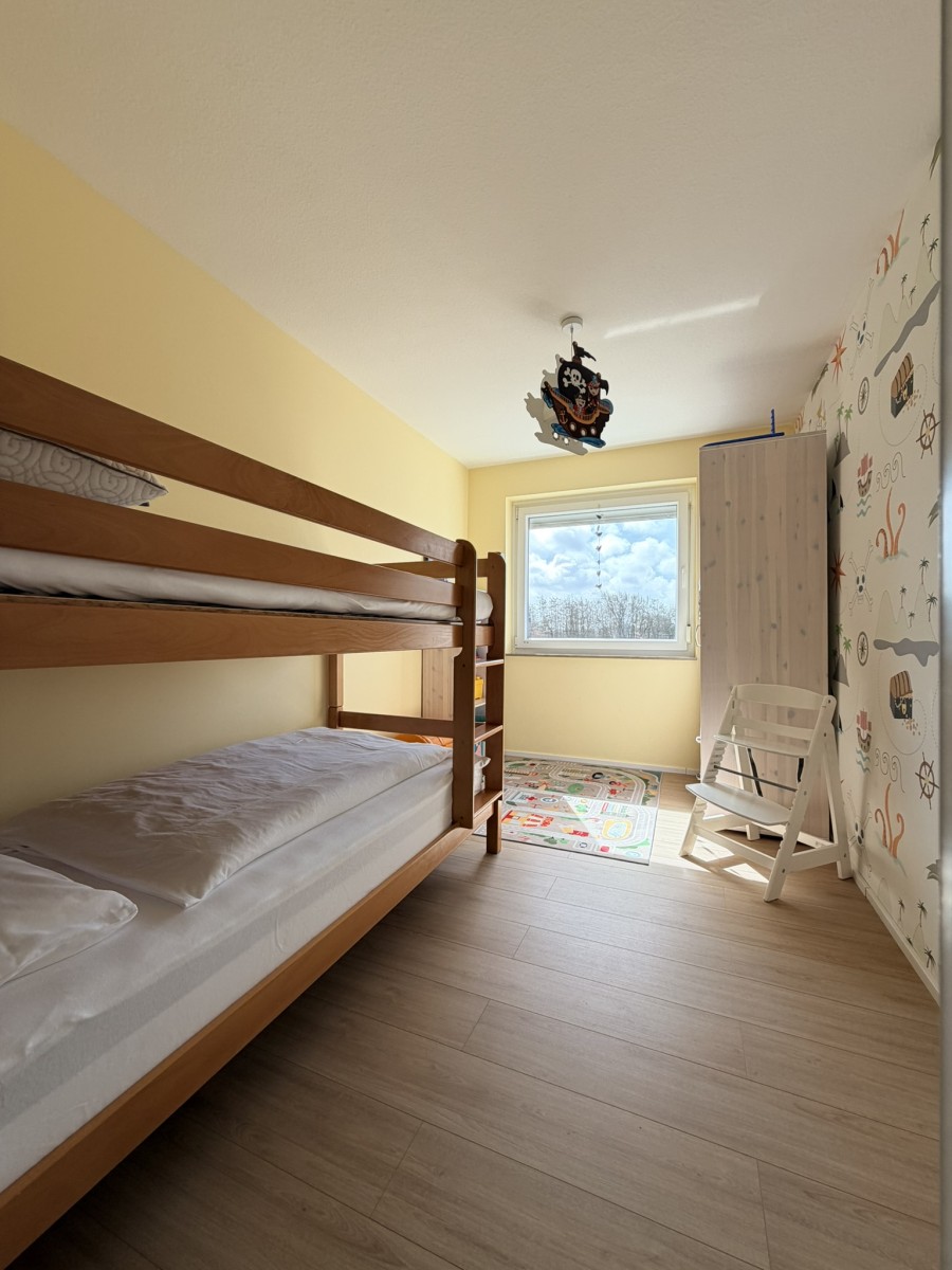 Alle drei Schlafzimmer lassen sich mit Außenjalousien verdunkeln. Aufgeteilt sind sie wie folgt: 1. SZ mit Doppelbett, 2. SZ mit Hochbett und Kinderspielzeug, 3. SZ mit zwei Boxspringbetten.