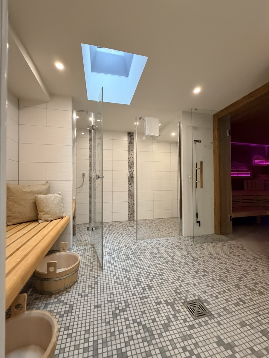Ein modernes Badezimmer mit Dusche, Waschtisch, Spiegel und WC runden diese schöne Ferienwohnung ab.
