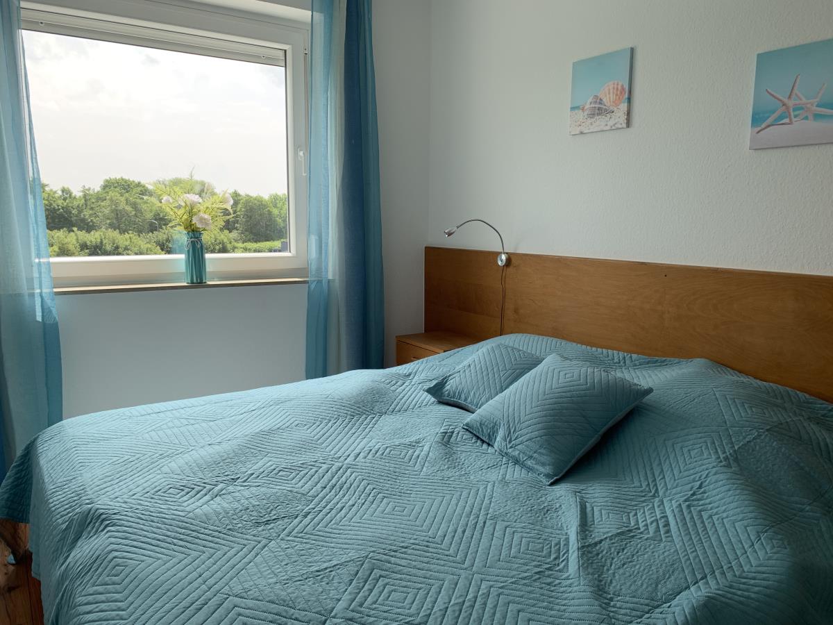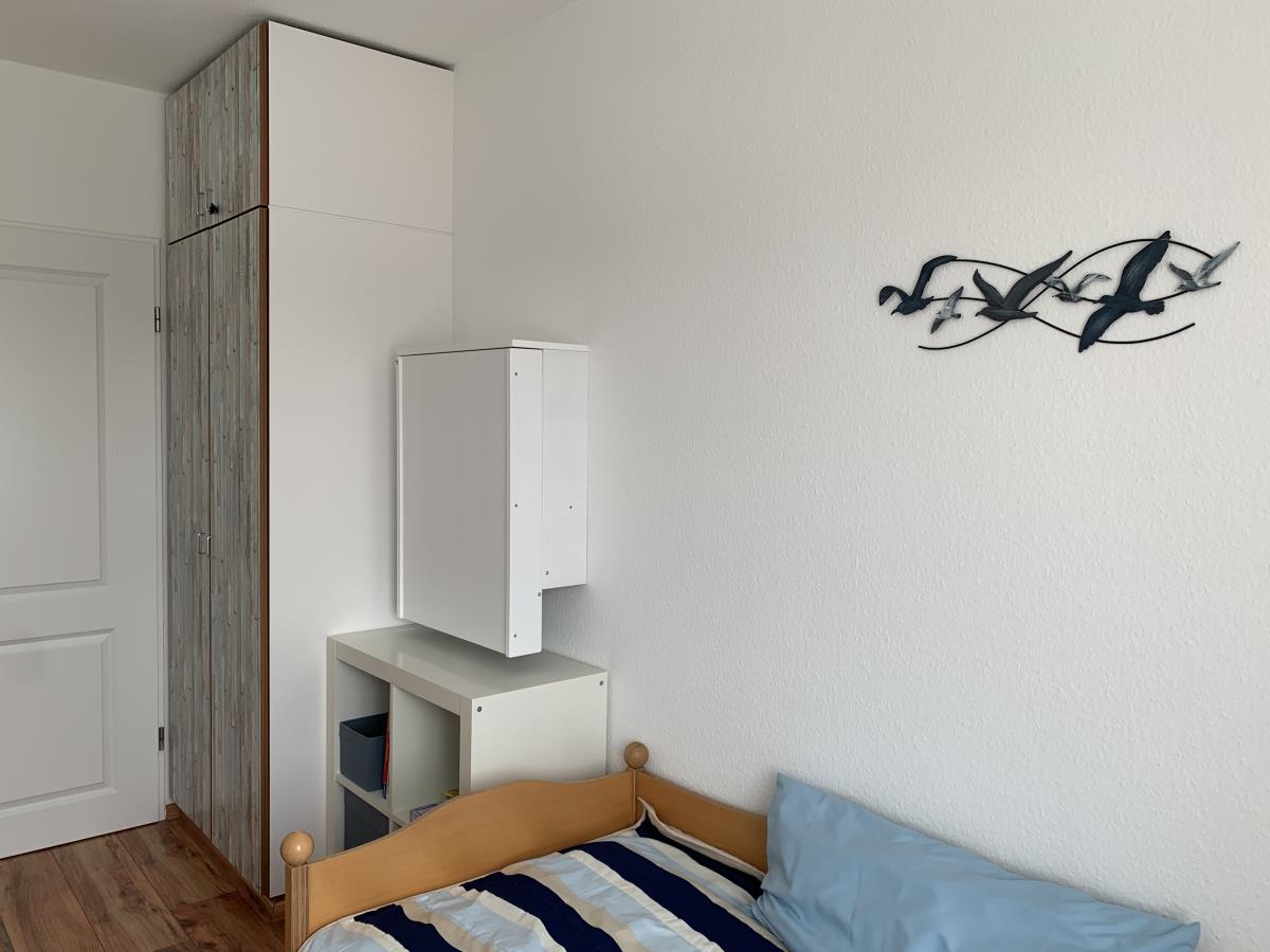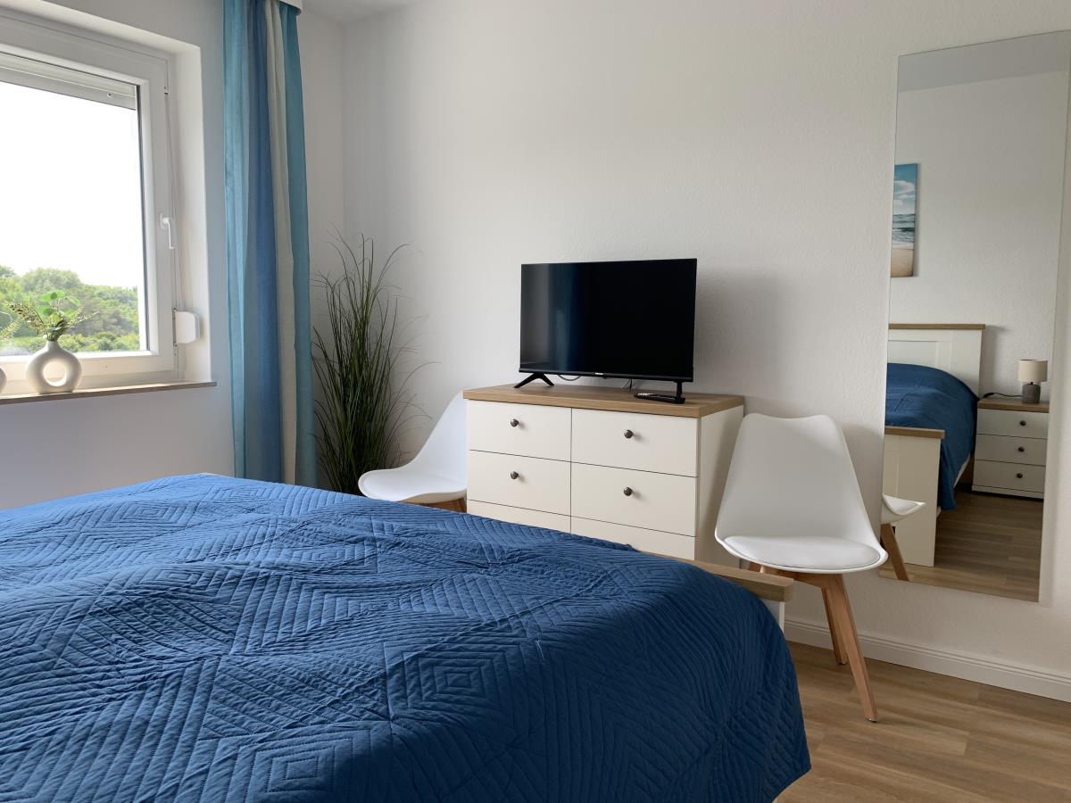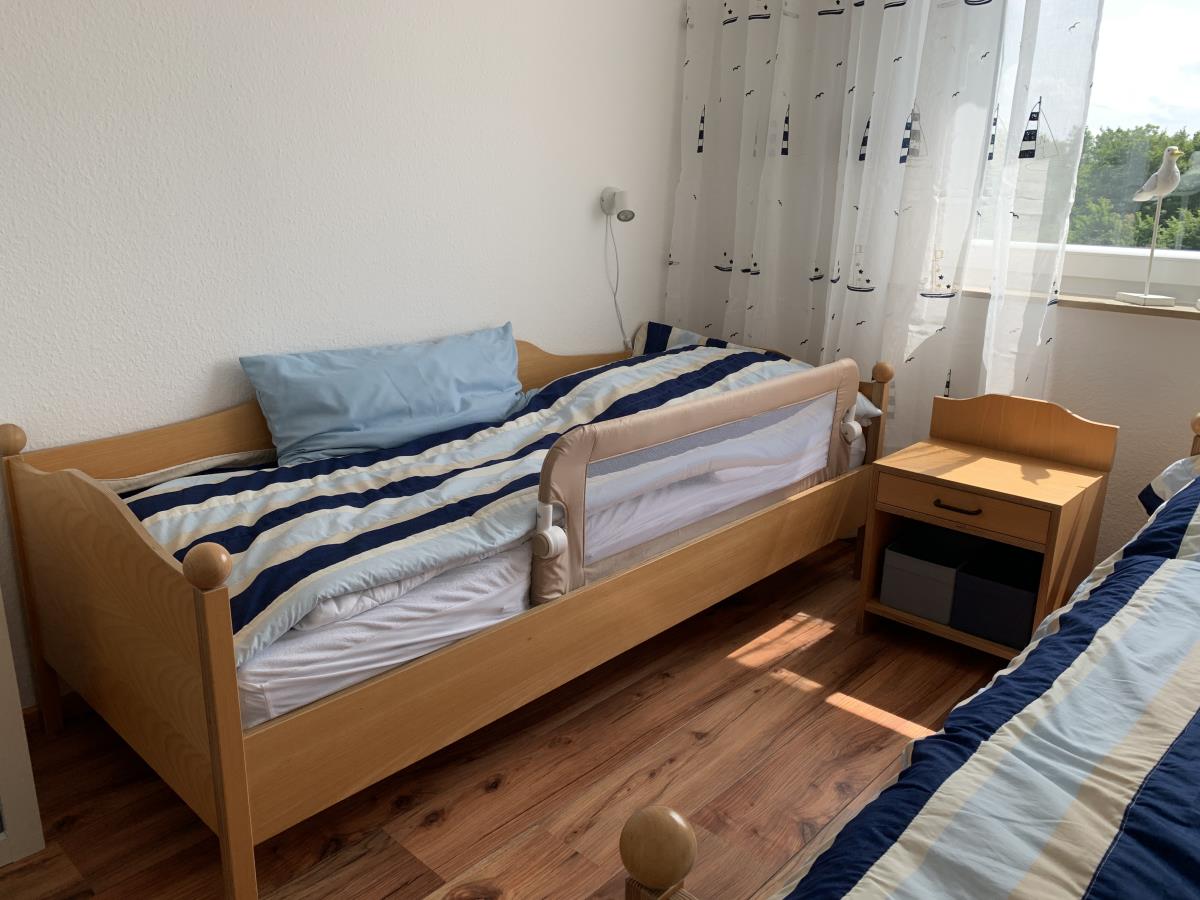 Alle drei Schlafzimmer lassen sich mit Außenjalousien verdunkeln. Aufgeteilt sind sie wie folgt: 1. SZ mit Doppelbett und Fernseher, 2. SZ mit Doppelbett, 3. SZ mit zwei Einzelbetten und einem Wickeltisch, der bei Bedarf aufgeklappt werden kann.