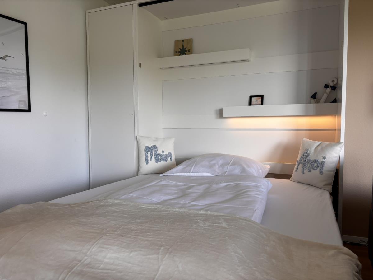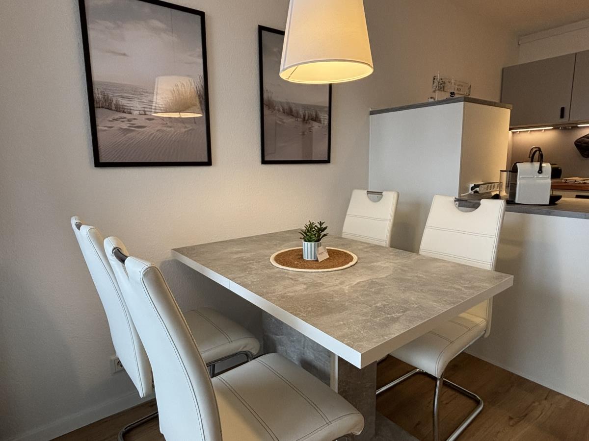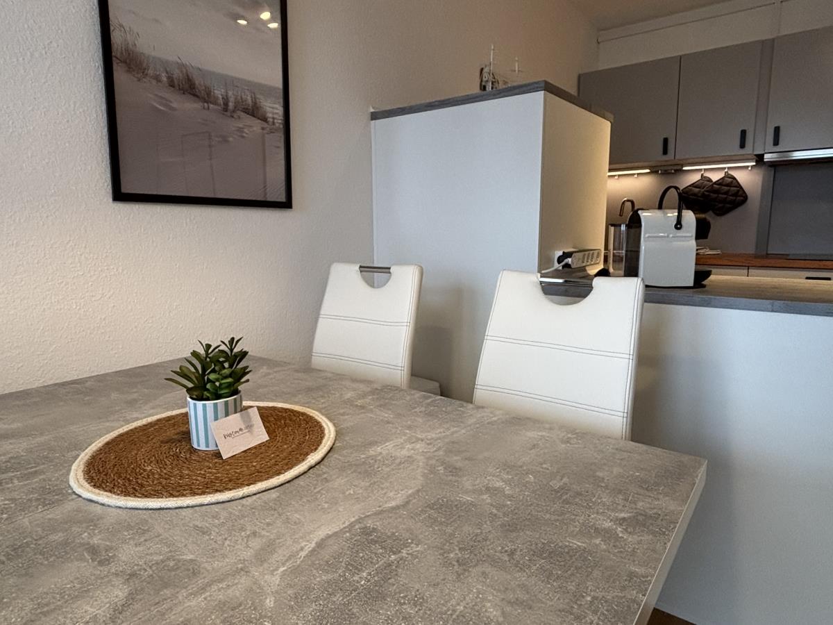 Die Wohnung bietet Platz für 2 bis 4 Personen und überzeugt mit einer gemütlichen Einrichtung. Der Wohnbereich ist mit einem TV ausgestattet und umfasst eine bequeme Couch, einen Essbereich sowie einem modernen und komfortablen Schrankbett (160x200) - ideal für eine Familie mit Kindern. Die Preise sind für eine Belegung von 2 Personen, für jede weitere Person berechnen wir einen Aufschlag von 10,00 € pro Nacht. Die Endreinigung ist ab der ersten Nacht eingerechnet.