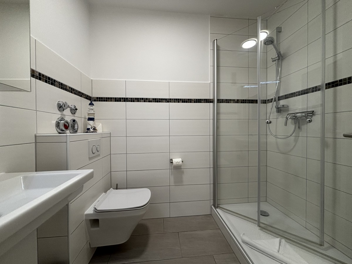 Das moderne Badezimmer ist mit einer Dusche, einem WC und einem Waschtisch mit Spiegel ausgestattet, sodass Sie sich nach einem Tag am Strand frisch machen können.