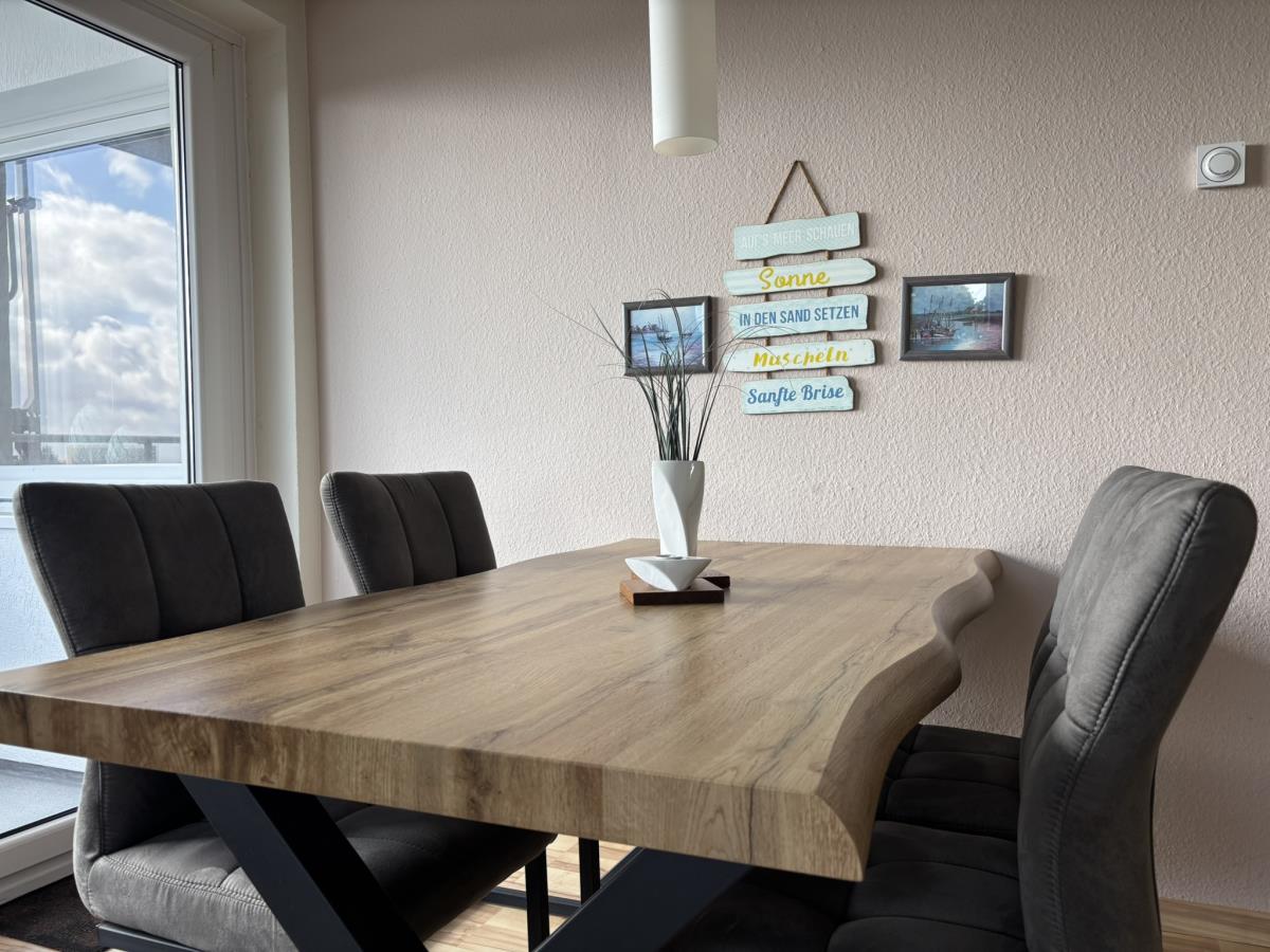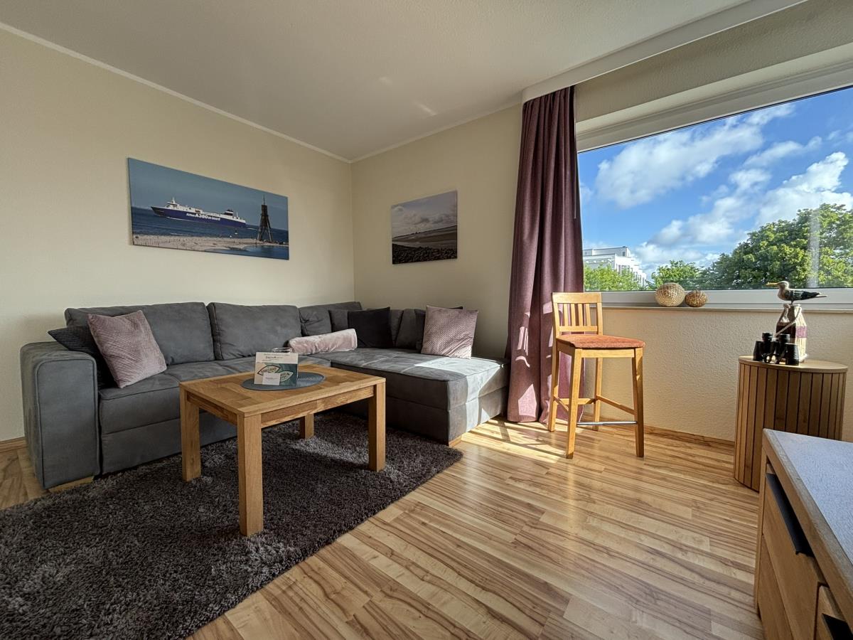 Die Wohnung bietet Platz für 2 bis 3 Personen und überzeugt mit einer gemütlichen Einrichtung. Der Wohnbereich ist mit einem TV ausgestattet und umfasst eine bequeme Sitzgruppe, einen Essbereich sowie eine Eckcouch mit Schlaffunktion – ideal für einen erholsamen Abend.