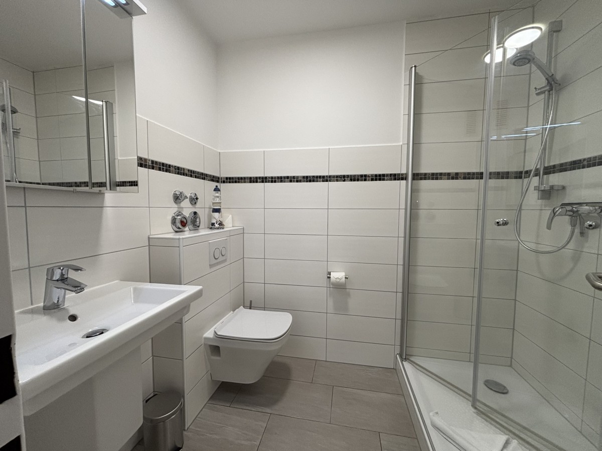 Das moderne Badezimmer ist mit einer Dusche, einem WC und einem Waschtisch mit Spiegel ausgestattet, sodass Sie sich nach einem Tag am Strand frisch machen können.