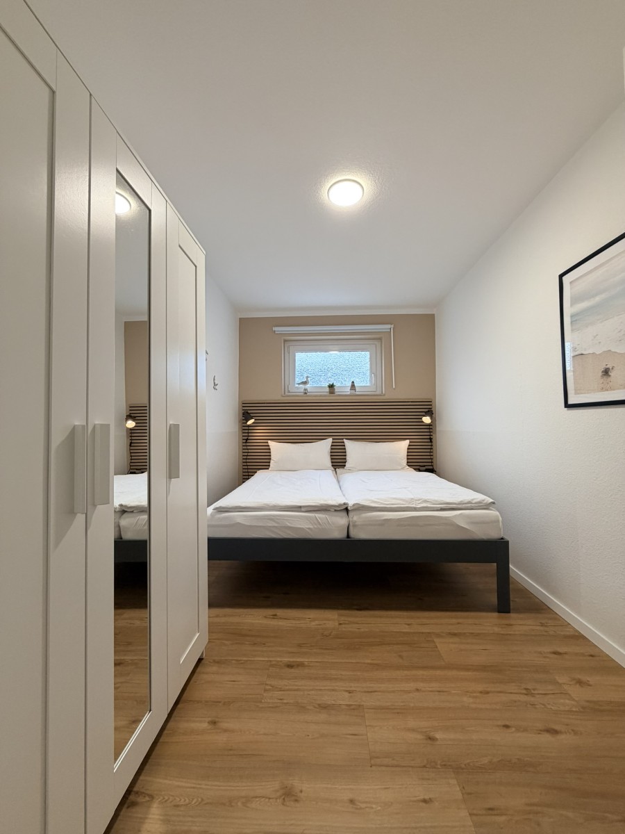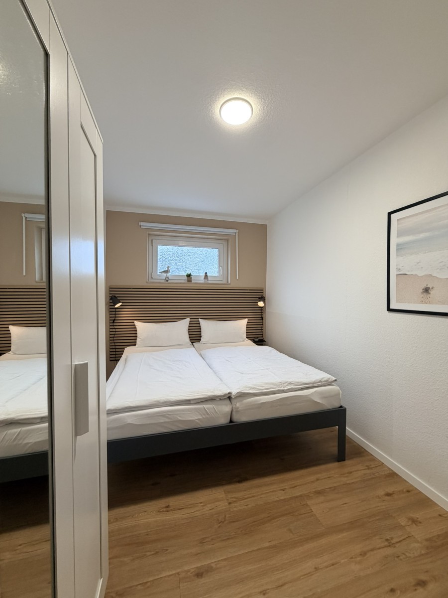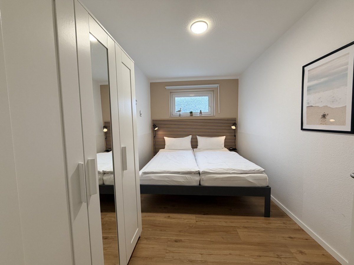 Die Wohnung bietet Platz für 2 bis 4 Personen und überzeugt mit einer gemütlichen Einrichtung. Der Wohnbereich ist mit einem TV ausgestattet und umfasst eine bequeme Couch, einen Essbereich sowie einem modernen und komfortablen Schrankbett (160x200) - ideal für eine Familie mit Kindern. Im Schlafzimmer erwarten Sie ein Doppelbett (180x200) sowie Stauraum im Kleiderschrank für Ihre persönlichen Dinge.