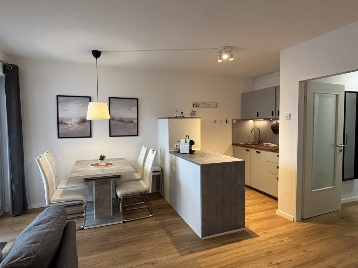 Die Wohnung bietet Platz für 2 bis 4 Personen und überzeugt mit einer gemütlichen Einrichtung. Der Wohnbereich ist mit einem TV ausgestattet und umfasst eine bequeme Couch, einen Essbereich sowie einem modernen und komfortablen Schrankbett (160x200) - ideal für eine Familie mit Kindern. Die Preise sind für eine Belegung von 2 Personen, für jede weitere Person berechnen wir einen Aufschlag von 10,00 € pro Nacht. Die Endreinigung ist ab der ersten Nacht eingerechnet.